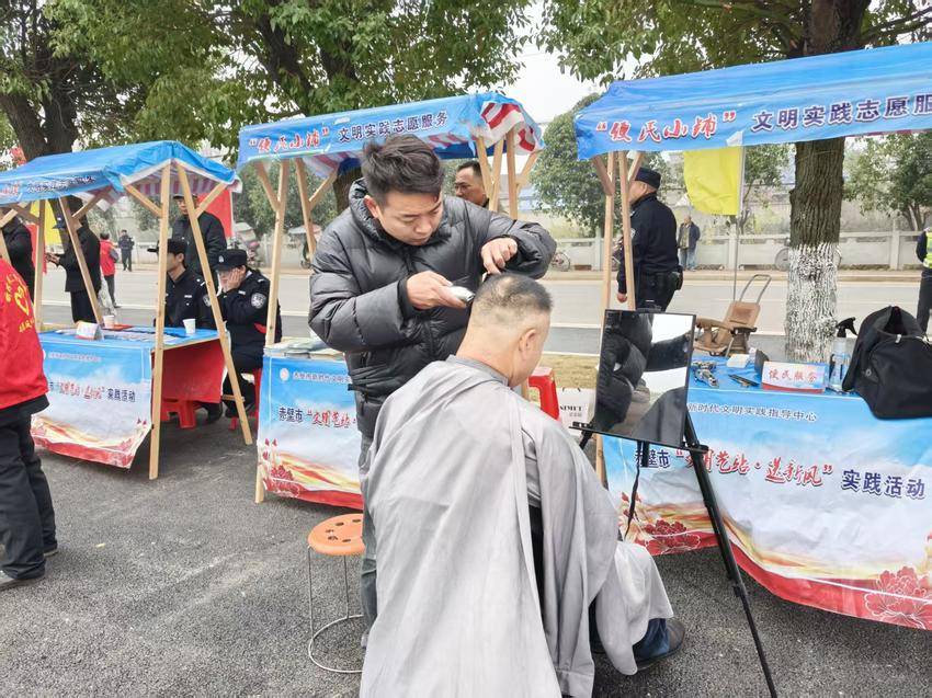 在乡村集市的便民服务摊位前,志愿者们支起理发工具、摆好笔墨纸砚,为居民提供免费理发和送春联服务。“叔叔您坐好,我再给您修修鬓角。”志愿者熟练地为一位70多岁的老人修剪头发,老人理完发后连连道谢:“在家门口就能免费理发,还能拿到手写春联,你们真是帮了大忙!”。