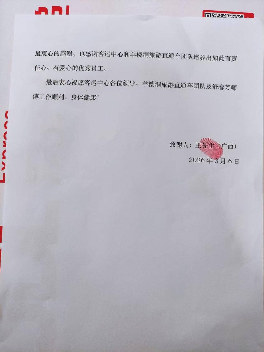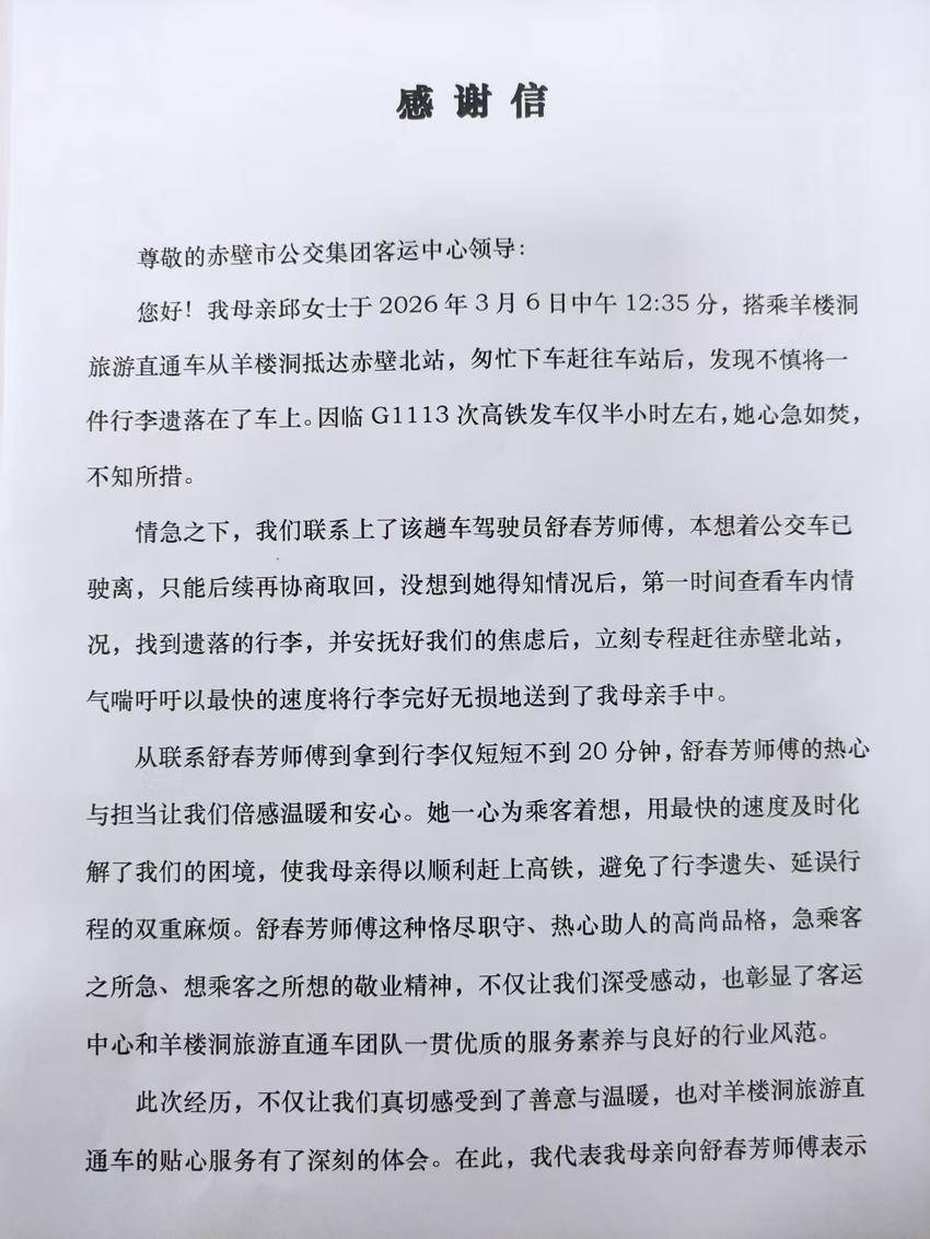 3月9日,赤壁公交集团收到广西游客王先生的感谢信,信中讲述了行李失而复得的暖心事,盛赞公交驾驶员舒春芳的热心服务,彰显了赤壁公交人爱岗敬业、拾金不昧的职业本色,也传递出外地游客对赤壁的认可。