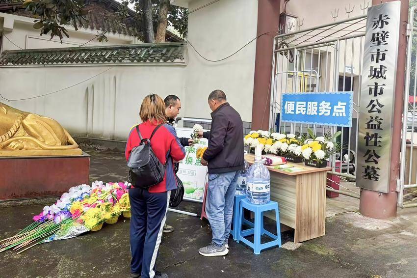 清明将至,赤壁市城市公益性公墓设置“便民服务+鲜花置换”点,推出“塑料花换鲜花”服务,倡导绿色环保、文明安全的祭扫新风尚,引导市民转变祭扫观念,让祭扫既环保又暖心。